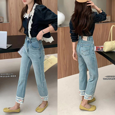 2024春夏新款国风蕾丝拼接直筒牛仔裤女显瘦九分小个子烟管裤